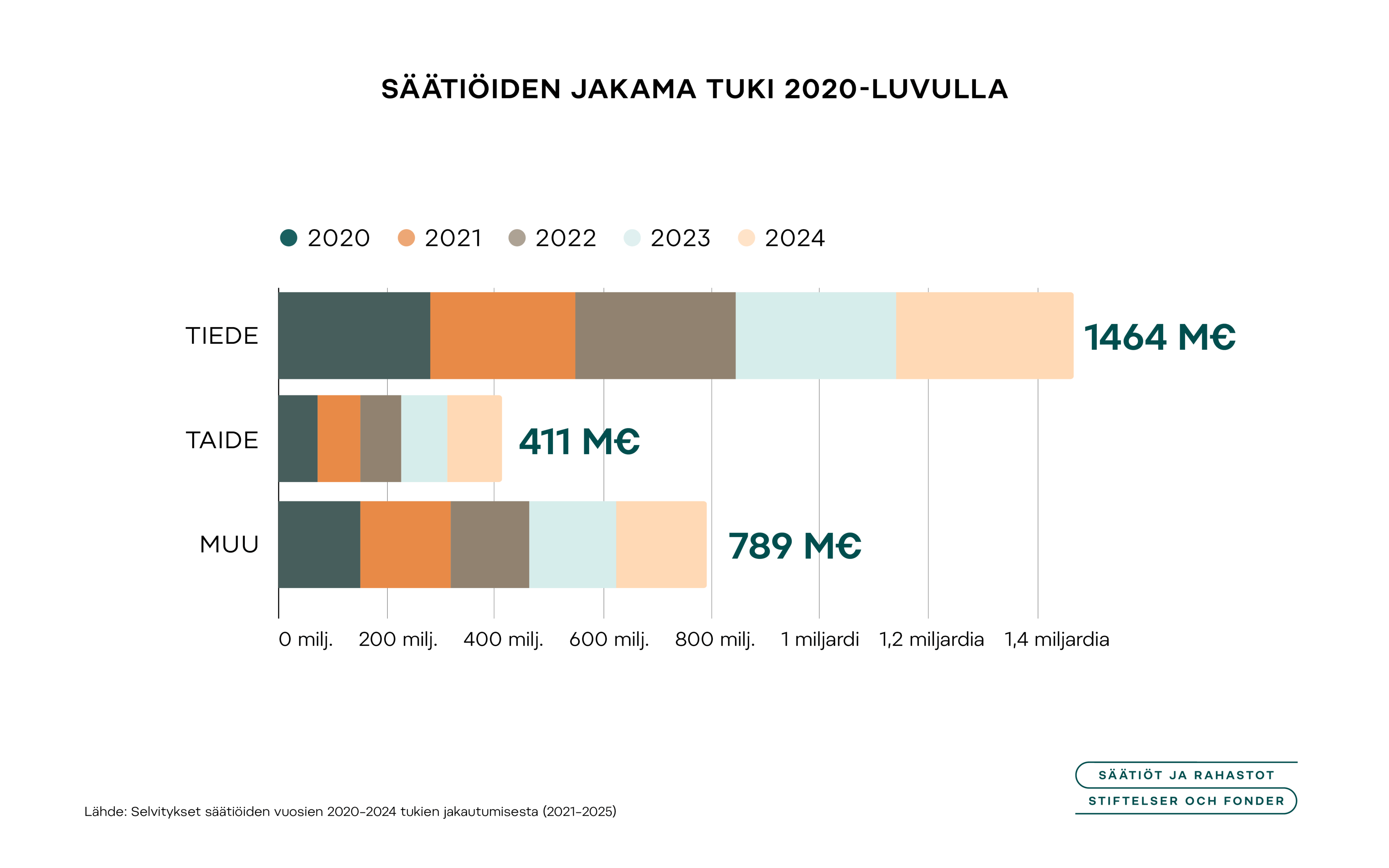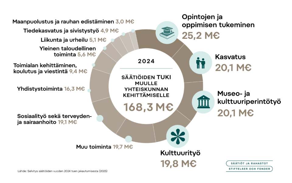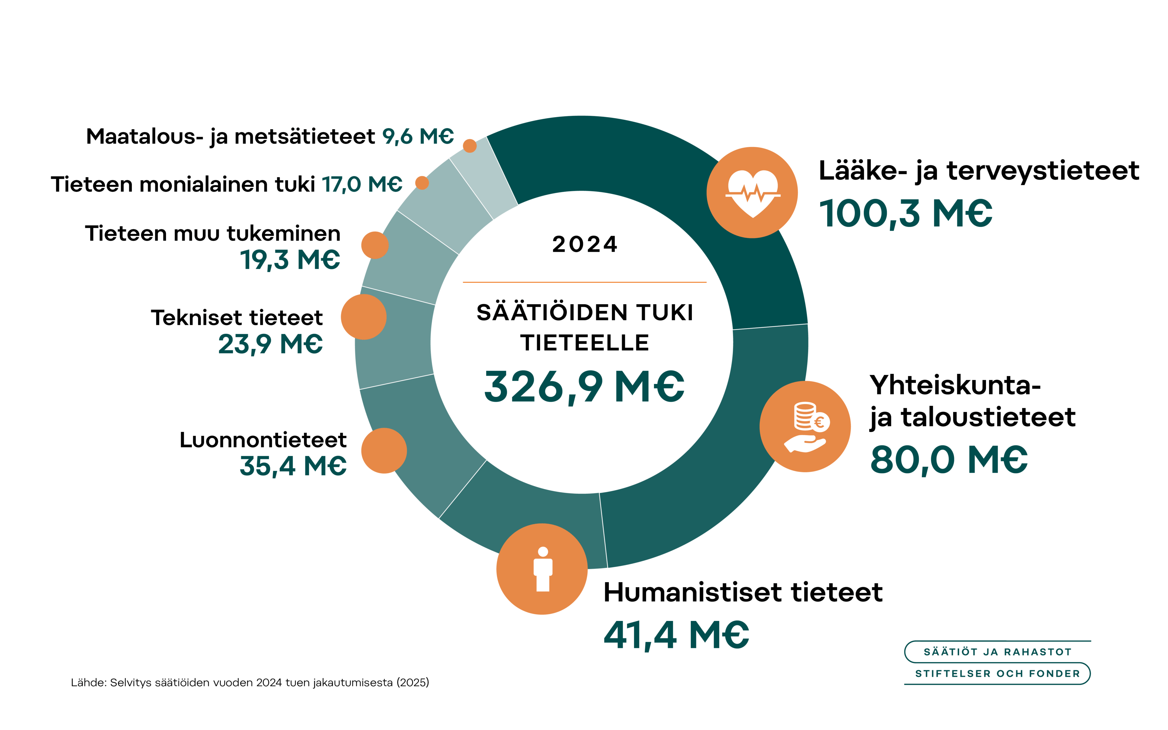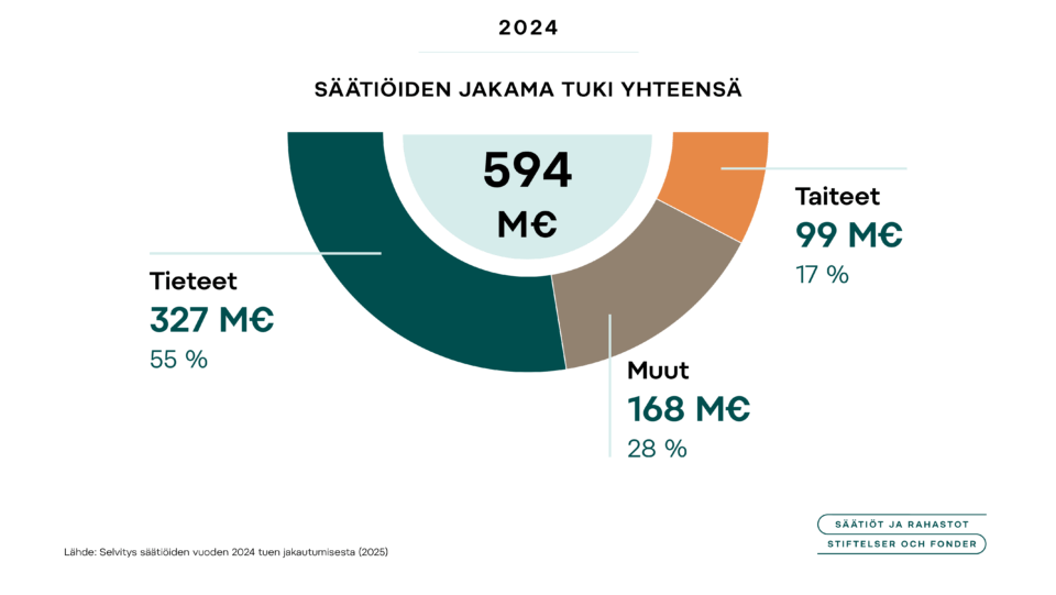Säätiöt ja rahastot ry:n jäsenet rahoittivat vuonna 2024 tiedettä 327 miljoonalla eurolla, taidetta 99 miljoonalla eurolla ja muuta yhteiskunnan kehittämistä 168 miljoonalla eurolla.