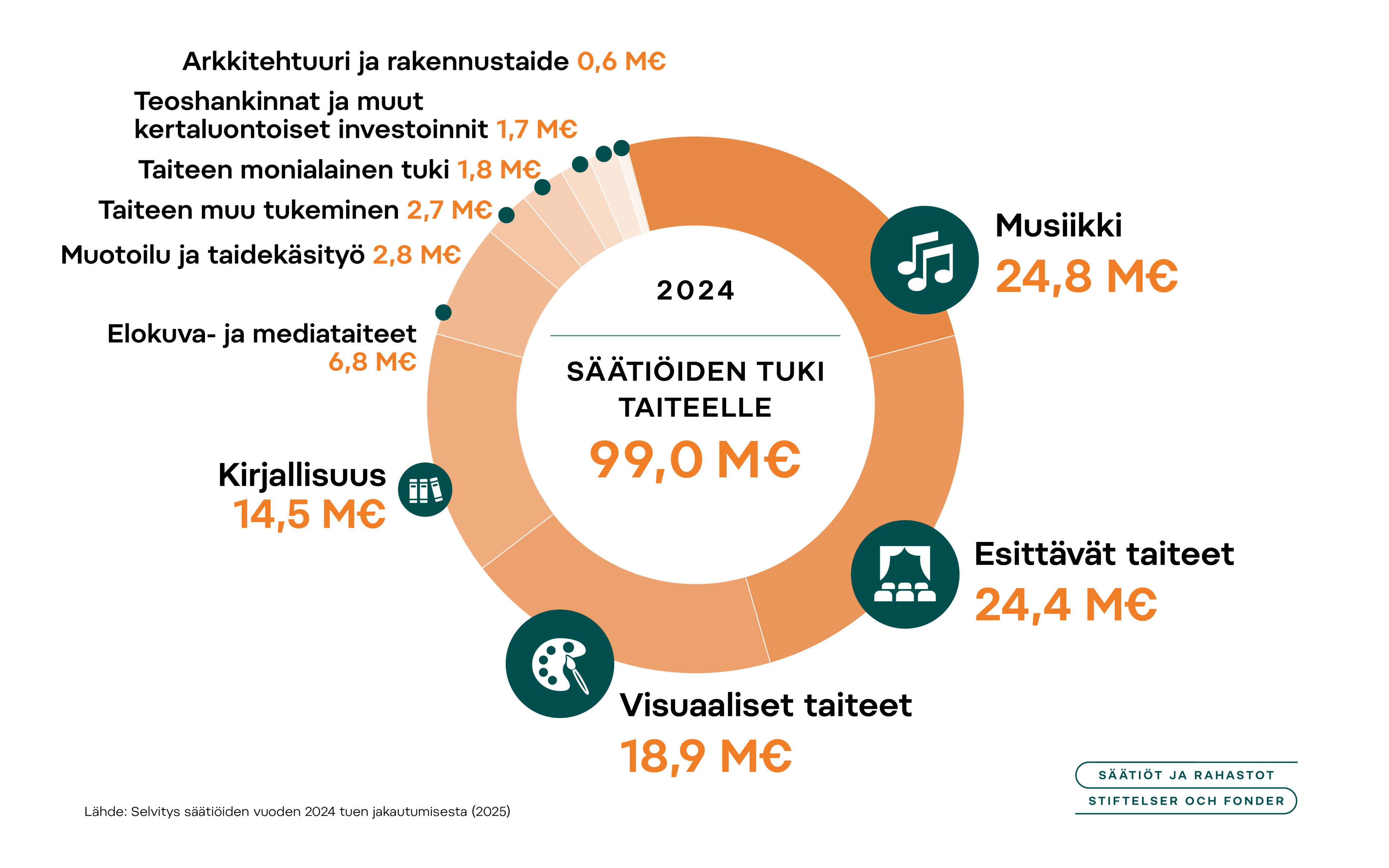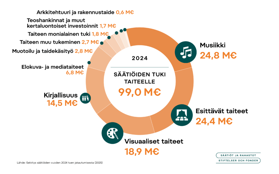 Yksityisten säätiöiden osuus taiteen ja kulttuurin tuesta on kasvanut reilussa vuosikymmenessä merkittävästi. Säätiöiden 99 miljoonan euron tuki taiteelle on huomattava.