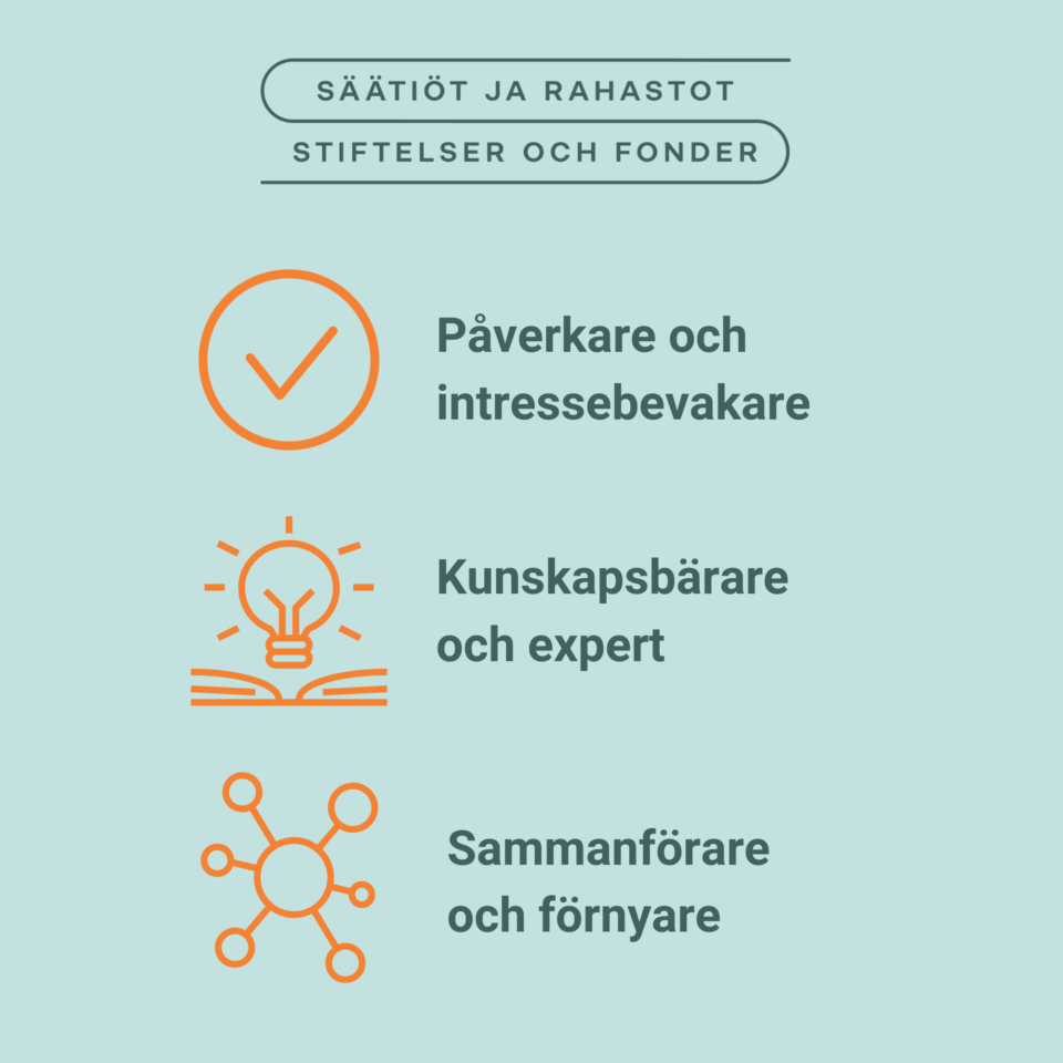 - samlar stiftelsefältet och skapar dialog och nya verksamhetsmodeller. Våra medlemmar representerar det finländska samhället i all dess mångfald.